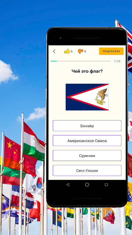 Если Вы не можете распознать флаг, то можете использовать подсказку после просмотра небольшого рекламного ролика. Подсказка поможет угадать ответ даже на самый сложный вопрос.