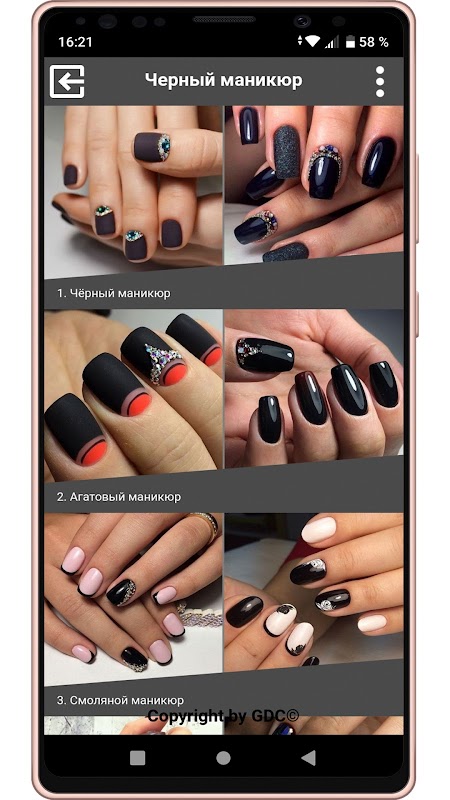 В нашем приложении Вы найдёте уникальные идеи маникюра, которые будут радовать Вас. С помощью приложения «Чёрный маникюр», Вы будете оригинально выделяться среди друзей и знакомых. В приложении вы найдете более 100 неповторимых идей маникюра и дизайна ногтей. В тоже время, Вы всегда сможете подобрать определенный стиль, который будет отличать Вас от окружающих. Наше приложение подойдет как взрослым самостоятельным женщинам, так и юным энергичным девушкам. Радуйте себя и будьте всегда на Олимпе стиля.