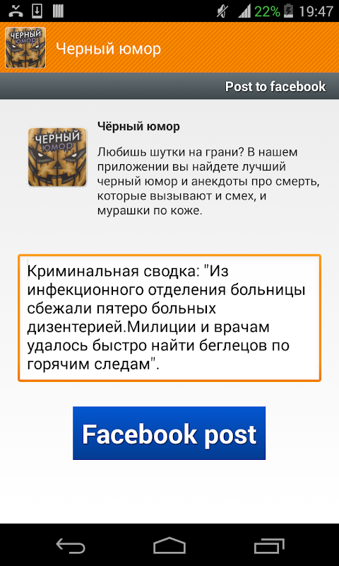 Врачи утверждают, что смех продлевает жизнь, а смех над болезнями и смертью помогает избавиться от внутренних страхов и депрессии, так что можно смело утверждать, что, устанавливая наше приложение, вы открываете путь к здоровью и долголетию.