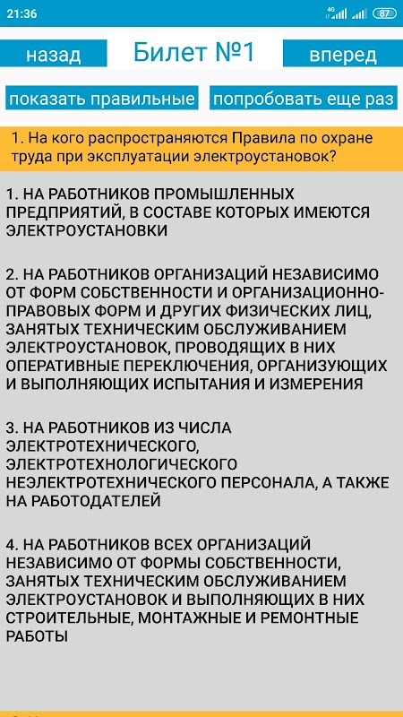 صارفین کی برقی تنصیبات چلانے والی تنظیموں کے الیکٹریکل اور الیکٹرو ٹیکنیکل اہلکاروں کے علم کی جانچ کے لیے تیاری (1000 V سے اوپر برقی حفاظت کے لیے V گروپ)۔ ضمیمہ 2021 کے لیے Rostechnadzor کے سوالات اور جوابات کے ایڈیشن کے مطابق مرتب کیا گیا تھا۔ یہ پروگرام (آزمائشی) کا مفت ورژن ہے، اس میں صرف 10 ٹکٹیں دستیاب ہیں اور اس میں اشتہارات ہیں۔