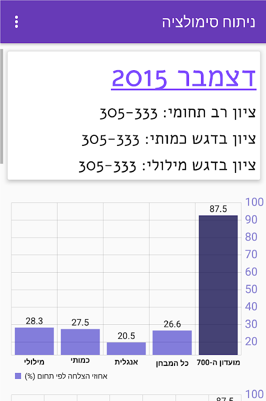 ניתוחי סימולציות - פתרתם בחינה מאפריל 2015, ועכשיו אתם רוצים לדעת מה הציון שלכם. אז במקום לספור כמה תשובות נכונות יש, ואז לגשת לאומדן, אתם יכולים להזין את כל התשובות באפליקציה ולקבל ניתוח סימולציה מפורט: