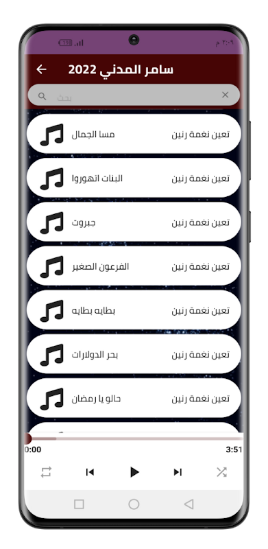 سمر المدنی 2023 کے گانوں کی ایپلی کیشن نیٹ کے بغیر آپ کو سمیر المدنی کے گانے سننے کے قابل بناتی ہے، سمر المدنی کے گانے بجا کر، ایپلی کیشن سے باہر نکل کر اور دیگر ایپلی کیشنز کو براؤز کر کے۔
