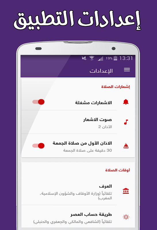 - تنبيهات لأوقات الصلوات، مع إمكانية اختيار صوت الأذان لكل صلاة على حدة