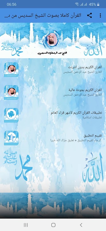 انٹرنیٹ کے بغیر شیخ السودیس کی آواز کے ساتھ پورے قرآن کا اطلاق آپ کو باڑ کو دہرانے اور خود کار طریقے سے ٹرانسمیشن کا امکان فراہم کرتا ہے۔
