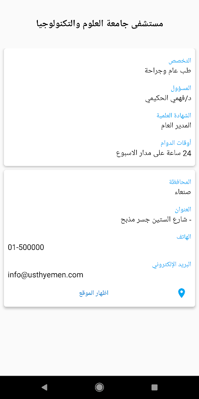 یہ شعبہ طبی سہولیات کے بارے میں تمام معلومات ظاہر کرتا ہے ، جو ہیں: (اس سہولت کا نام ، ذمہ دار فرد ، سرٹیفکیٹ ، آپریشن کے اوقات ، پتہ ، فون ، سوشل میڈیا ڈیٹا ، طبی عملے کا ڈیٹا ، سہولت کا پروفائل ، سہولت کا لوگو)