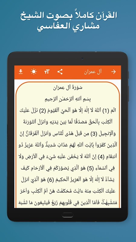 ایپلی کیشن آپ کو شیخ مشاری الافاسی کی آواز میں پورا قرآن سننے کی سہولت فراہم کرتی ہے اور آپ کو انٹرنیٹ کے بغیر قرآن پڑھنے کی سہولت فراہم کرتی ہے۔ صرف سننے کے لیے انٹرنیٹ کی ضرورت ہوتی ہے۔