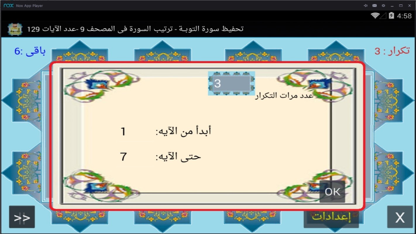 1 سے 7 بار تک تلاوت کی تکرار کی تعداد منتخب کریں۔