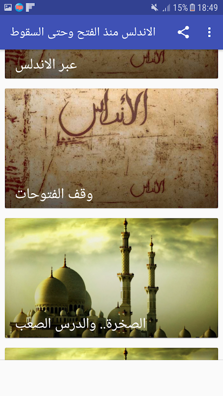 ويضم هذا التطبيق العديد من الفصول والتي تغطي اغلب الأحداث التي وقعت خلال فترة الحكم الإسلامي للأندلس في تطبيق تاريخ الاندلس من الفتح وحتى السقوط.
