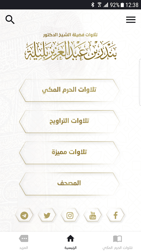 ہم اس میں مکہ مکرمہ میں مسجد نبوی کی تلاوت سالوں اور مہینوں کے مطابق شائع کرتے ہیں ، اس کی مخصوص تلاوت کی ایک خصوصی فہرست ، مکمل قرآن اور دیگر بہت کچھ ..
