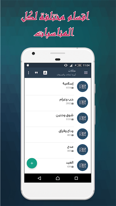 - اقسام التطبيق " حالات صباحية,حالات مسائية, حالات اسلامية, حالات ادعية تريح القلوب, حالات تهنئة بالزواج, حالات تهنئة بالخطوبة,