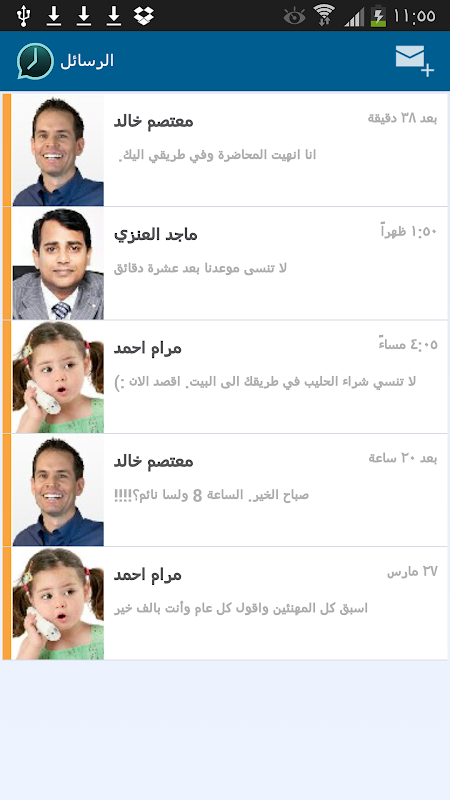 لاضافة رسالة جديدة انقر ايقونة الرسالة في الجزء العلوي من الشاشة, قم بادخال محتوى الرسالة واسماء المرسل اليهم ثم قم بتعيين تاريخ وساعة الارسال. ثم قم بحفظ الرسالة.