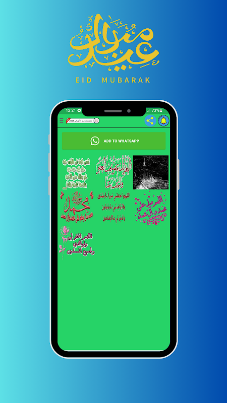 عید الاضحی اور عید الفطر کے مبارکبادی اسٹیکرز ایک مفت واٹس ایپ شیئرنگ ایپ ہے جو چیٹنگ اور میسجنگ کو مزید پرلطف، منفرد اور شاندار بنا سکتی ہے۔ ابھی اسٹیکر پیک شامل کرنے سے لطف اٹھائیں۔