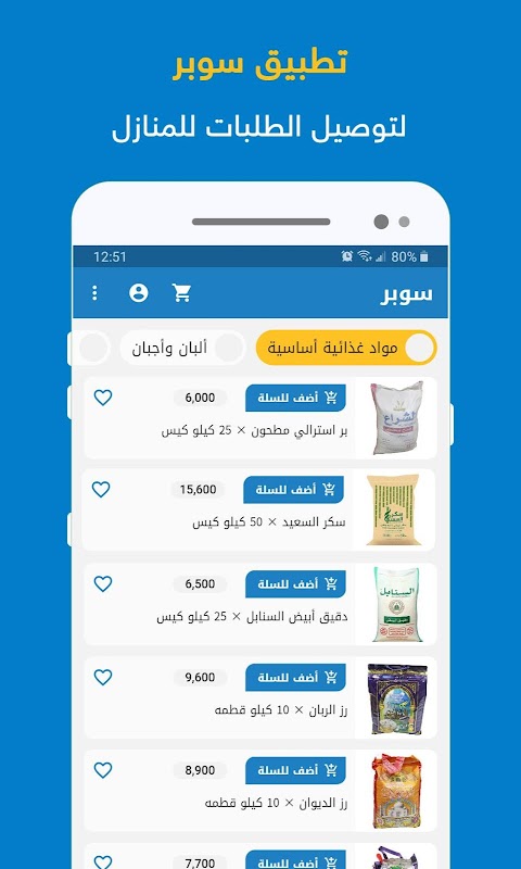 یہ ایپ ضروری اشیا کو گھر لانے کے لئے ہے۔ اس خدمت میں فی الحال صنعا ، اور جلد ہی مزید صوبے اور مزید مصنوعات شامل ہیں۔