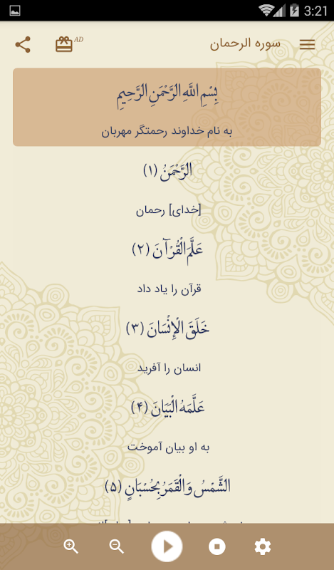 سور Surah الرحمن آڈیو عبدالباسط ، متقی ، محمد جبریل کی آواز اور ہدایت فیر کے آڈیو ترجمے کے ساتھ۔ جدید نظر کے ساتھ ، آٹو سکرولنگ اور نائٹ تھیم کے ساتھ انٹرنیٹ کی ضرورت نہیں ہے۔ کچھ روایات کے مطابق ، اگر کوئی سور Surah الرحمن کی تلاوت کرے گا تو خدا اسے شکر ادا کرنے میں کامیابی عطا کرے گا ، اور اگر وہ اس دن یا رات کو مرجائے گا تو وہ شہید سمجھا جائے گا۔