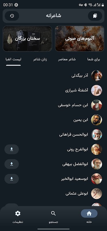 گنجور سائٹ سے ایپ میں فارسی نظموں کا ایک مکمل مجموعہ شامل کیا گیا ہے، اور آپ کو فارسی نظموں تک مکمل رسائی حاصل ہے، اور آپ ہر شاعر کی نظموں کو الگ الگ ڈاؤن لوڈ کر کے آف لائن استعمال کر سکتے ہیں۔ شاعروں کی کتابوں کے علاوہ، آپ شاعر کی سوانح عمری، پروفائل، رہائش کی جگہ اور تصاویر تک رسائی حاصل کر سکتے ہیں۔