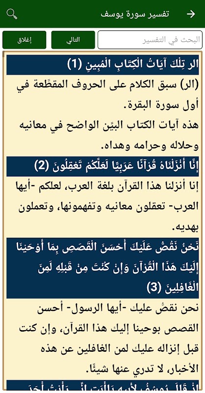 ایپلی کیشن کے ذریعے، آپ قرآن کی سورتوں کی تفسیر مکمل اور مفت پڑھ سکتے ہیں، اور آپ آیت کی تفسیر کاپی کر کے جس کو چاہیں بھیج سکتے ہیں، آپ جلدی سے کسی کی بھی تفسیر تلاش کر سکتے ہیں۔ آیت