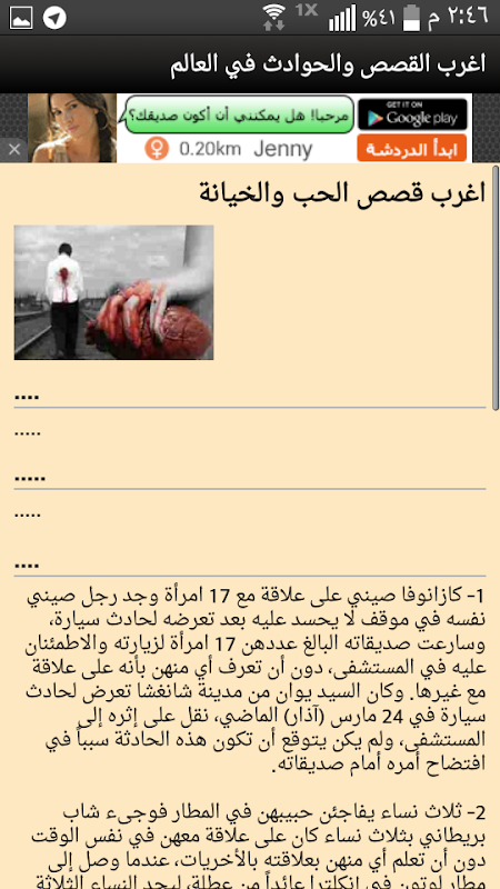تطبيق(اغرب القصص والحوادث في العالم)هو عمل يحتوي على ابرز واغرب القصص والحوادث الواقعية التي حصلت بالعالم على مر التاريخ ، قصص حقيقية أغرب من الخيال، قصص قصيرة وواقعية مضحكة ونحن اخر من يعلم بها ، وقصص اخرى حزينة ومؤثرة ، قصص عجيبة في الحب والخيانة والحياه العاطفية ، قصص واقعية مضحكة في غاية الغرابة والاندهاش وقصص اخرى مرعبة حصلت بهذا العالم الغريب والعجيب ، لا تحتاج الى انترنت لتصفح القصص وقراءتها .
