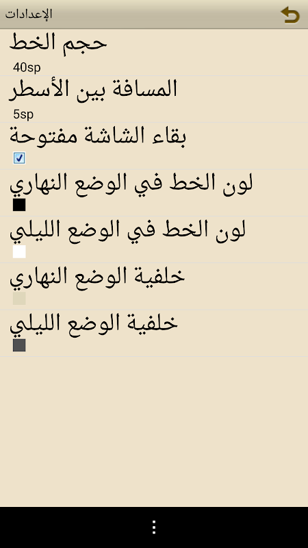 5- فونٹ کو ایڈجسٹ کرنے کا امکان (چھوٹا / بڑا)، ساتھ ہی پس منظر کے رنگ کو تبدیل کرنے کی خصوصیت کے ساتھ ساتھ رات اور دن کے وقت پڑھنے کے درمیان انتخاب کرنے کی خصوصیت۔