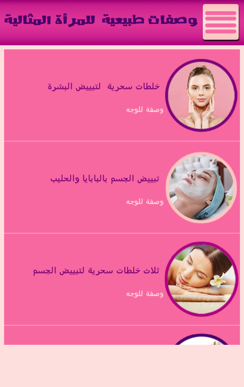 نقدم لكي اختي الكريمة هذا التطبيق وصفات طبيعية للمرأة المثالية عبارة عن خلاصة اروع خلطات لتطويل الشعر و خلطات تبيض الوجه ، فالكثير من السيدات و اغلب الفتيات يبحثن عن خلطة زيوت لتطويل الشعر او زيوت لتكثيف الشعر و الكثير منهم يسأل ماهو افضل زيت لتطويل الشعر ونجد نساء اخرى يبحثن عن خلطات تبيض الوجه او قناع للوجه و يوجد العديد من خلطات للوجه لكن دون فائدة مجرد مضيعة للوقت .