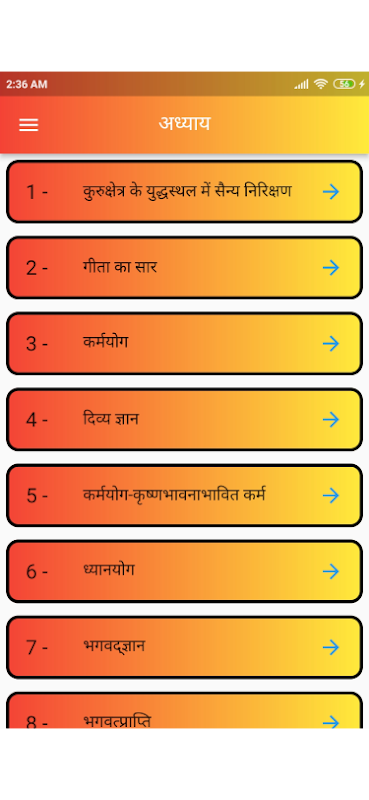 اس حیرت انگیز ایپ کو ایک خوبصورت اور استعمال میں آسان انٹرفیس کے ساتھ استعمال کرنا شروع کریں جس میں ہندی میں بھگوت گیتا کے مکمل ترجمے ہیں۔ آپ کی تلاش اس ایپ کے ساتھ یہاں ختم ہوتی ہے۔