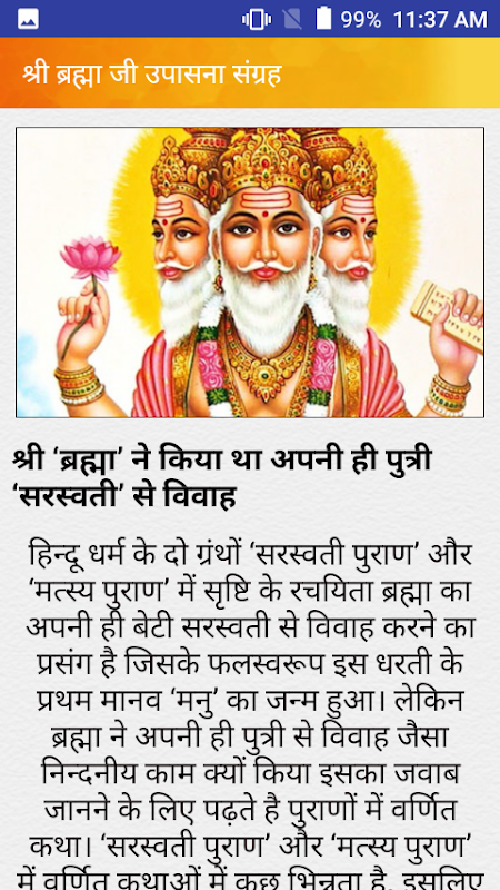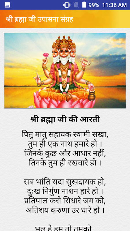 یہ ایک مفت اینڈروئیڈ ایپ ہے جس میں آرتی چالیسہ اسٹوٹی اور لارڈ شری برہما کی کتھا کا مکمل مجموعہ ہے۔ ہندو کے عقیدت مندوں کے ذریعہ لارڈ برہما ایک سب سے زیادہ پوجا ہوئے خدا ہیں۔ خیال کیا جاتا ہے کہ وہ خالق خدا ہے اور عظیم ہندو دیوتاؤں کی آزمائش میں اعلی ہے جس میں شیوا اور وشنو بھی شامل ہیں۔
