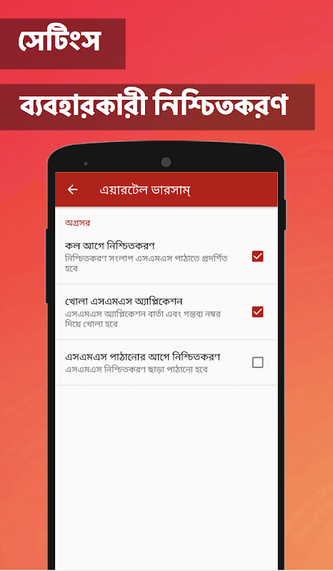 > "কলটির আগে নিশ্চিত করুন" উপলব্ধ বিকল্প এবং "এসএমএস পাঠানোর আগে নিশ্চিত করুন