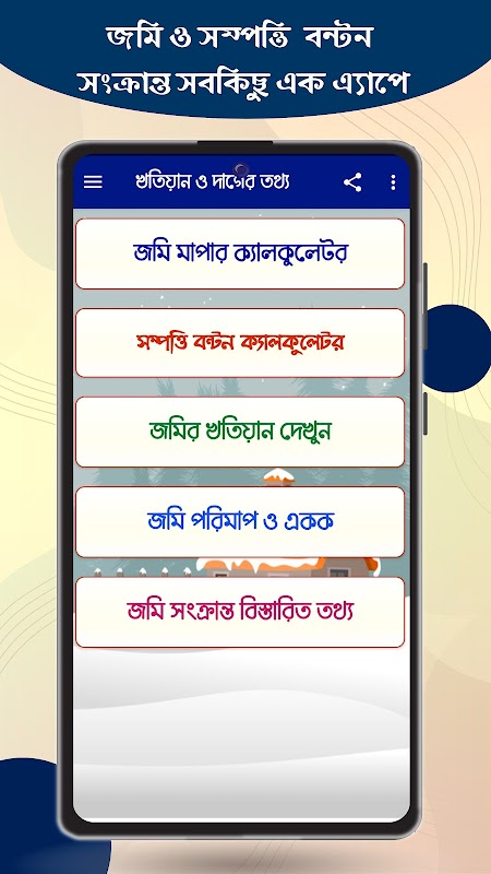 খতিয়ান ও দাগের তথ্য এ্যাপে ভুমি পরিমাপ ক্যালকুলেটরসহ জমি সংক্রান্ত তথ্য পাবেন।