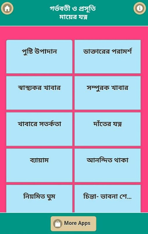 গর্ভবতী মায়ের বিভিন্ন সেবা মুলক তথ্য ও করনীয় বিষয় সমূহ দিয়ে সাজানো হয়েছে আমাদের এই এপস টি । এখানে আপনারা পাবেন গর্ভবতী মহিলার কি কি খাদ্যর প্রয়োজন, গর্ভবতী মহিলার কি টিকা নিতে হবে, গর্ভবতী মহিলার কি করা যাবে, কি করা যাবে না ইত্যাদি। আপনার সন্তান যেন সুস্থ,সবল ও সুন্দর হয়ে পৃথিবি আসতে পারে সেটাই আমাদের মুল লক্ষ্য।