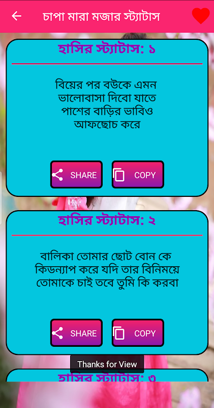 এই অ্যাপসটিতে যে সব হাসির জোকস স্ট্যাটাস আছে তা অপনি বন্দুদের সাথে ১ কিল্কে কপি এবং শেয়ার করতে পারবেন ।