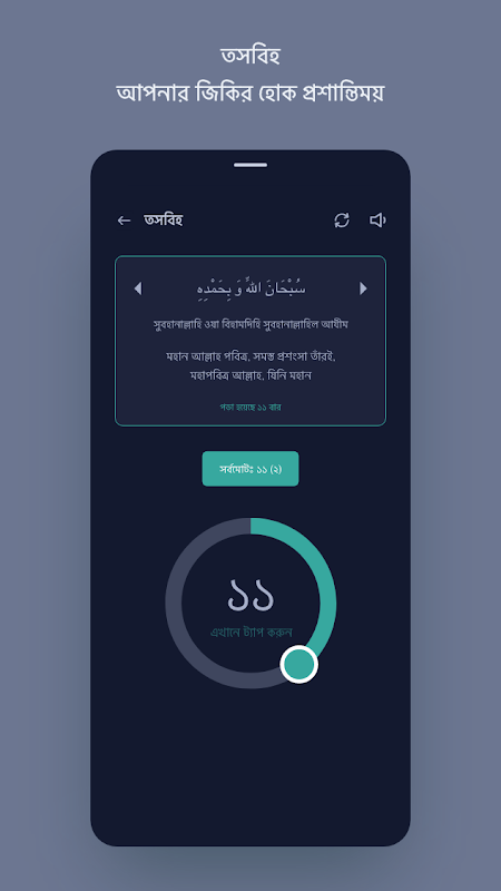✔ تسبیح استعمال کریں، اگر آپ کے ہاتھ میں کوئی تسبیح نہیں ہے۔ یہ خصوصیت آپ کو اپنے ذکر کو شمار کرنے میں مدد کرے گی جہاں بھی آپ ہوں۔