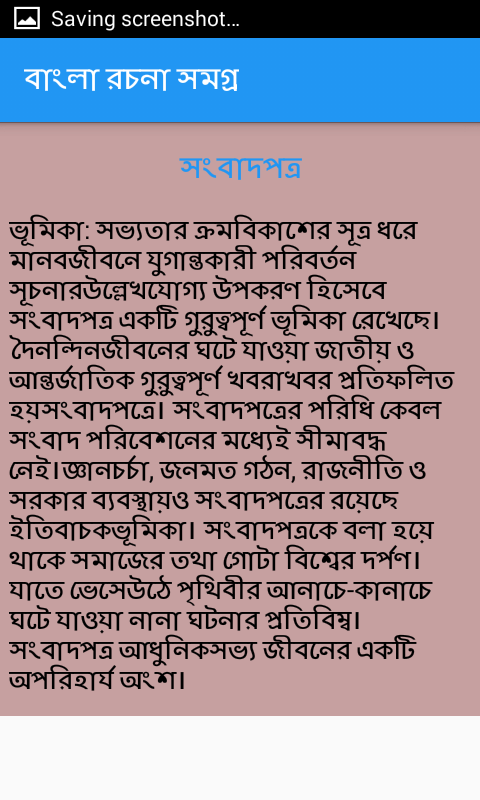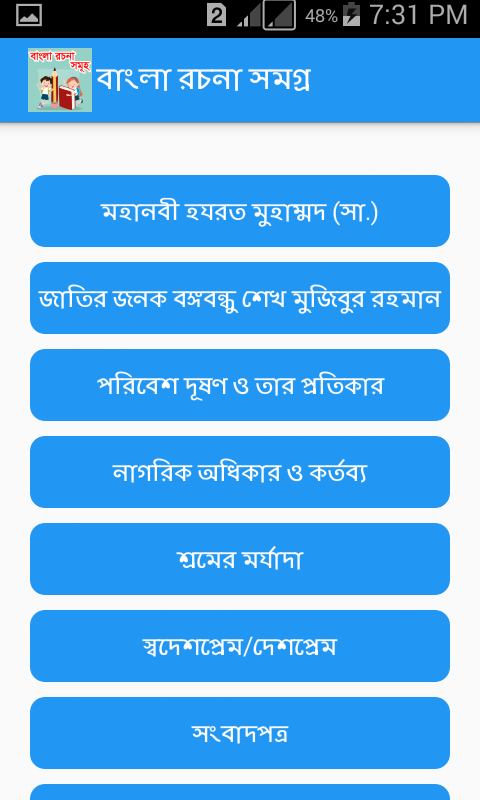 আর পড়াশুনার ক্ষেত্রে পঞ্চম শ্রেনী হতে শুরু করে উপরের সকল শিক্ষাগত জীবনে রচনা প্রয়োজন পড়ে । আর তাই এই অ্যাপটিতে জনপ্রিয় সবধরনের রচনা রয়েছে । যা আপনার শিক্ষাগত জীবনে খুব কাজে আসবে ।