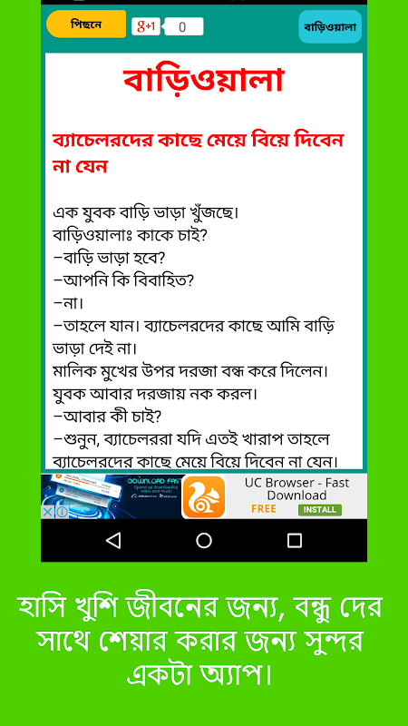 بنگلہ لطیفوں کی ایپ مضحکہ خیز لطیفوں کے بارے میں ہے جہاں بنگلہ کوٹوک ، ہاسیر کوٹک / ہزیر کوتوک ، موجر کوٹک مجر کوتوک ، محبت کے لطیفے بالغوں اور بچوں دونوں کے لئے شامل ہیں جو لطیفے کے مذاق کو پڑھتے ہیں جو بنگلا لطیفوں کے قارئین کے ل pleasure خوشی کا باعث ہے۔ اس بنگلہ لطیفے 2020 میں مختلف قسم کے بنگلہ لطیفے نئے ذائقہ پر مشتمل ہے جو کہ لطف اندوز ہونے کا ایک ذریعہ ثابت ہوسکتا ہے اور یہ بنگلہ میں ایک زبردست لطیفے ایپ ہوگی۔ یہ بنگلہ لطیفے ایس ایم ایس کے ذریعہ مختلف سوشل میڈیا میں شئیر کرنے کے لئے بھی ایک اچھا آپشن ہے اور امید ہے کہ ایسا ہوگا۔ اس لطیفے ایپ کو پڑھنے کے ل pleasant خوشگوار تجربہ بنیں۔
