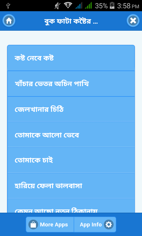কষ্ট মানুষের জীবনের এক গুরুত্বপূর্ণ সঙ্গী, আমরা চাইলেই কষ্টকে বাদ দিয়ে সুধু সুখ নিয়ে জীবন যাপন করতে পারি না। মানুষের মন বড় অভিমানী এবং আবেগি তাই এক একজনের কষ্ট প্রকাশ করার উপায়ও আলাদা। প্রাচীন কাল থেকেই মানুষ কষ্ট পেলে গান শুনতে পছন্দ করে। এই অ্যাপ এ আমরা ঠিক এমন কিছু কষ্টের গান দিয়েছি যা আপনার কষ্টে ভরা মনটাকে কিছুটা হলেও সুশীতল করে তুলবে। আমাদের এই কষ্টের বাংলা গান এবং বিরহের বাংলা গানগুলো শুনলে আপনার চোখের পানি ধরে রাখতে পারবেন না। আমাদের এই সাড়াজাগানো বাংলা গানগুলো বাংলা গানের বিশাল সমাহার থেকে সুধু কষ্ট পাওয়া মানুষের জন্য একত্রিত করা হয়েছে। আমাদের এই গানগুলো বিশেষত যারা তাঁদের ভালোবাসার মানুষকে হারিয়েছেন এবং এগুলো নষ্ট জীবনের কষ্টের গান। কষ্টে ভরা এই বাংলা গানগুলো মানুষের মুখে মুখেই সুনা যায়। আপনি শুনে খুশি হবেন যে আমাদের এখানে দেশের সকল বড় শিল্পীদের গানই রয়েছে।