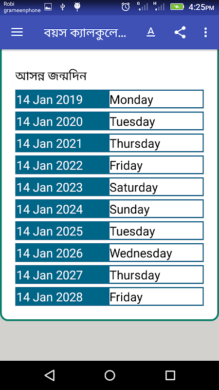 এ ছাড়া আপনার জন্ম দিন আসতে আর কত দিন কত মাস বাকি তার ও হিসাব পাবেন, সাথে আগামি ১০ বছরেরর জন্ম দিনের তারিখ এবং কি বার তাও জানতে পারবেন।