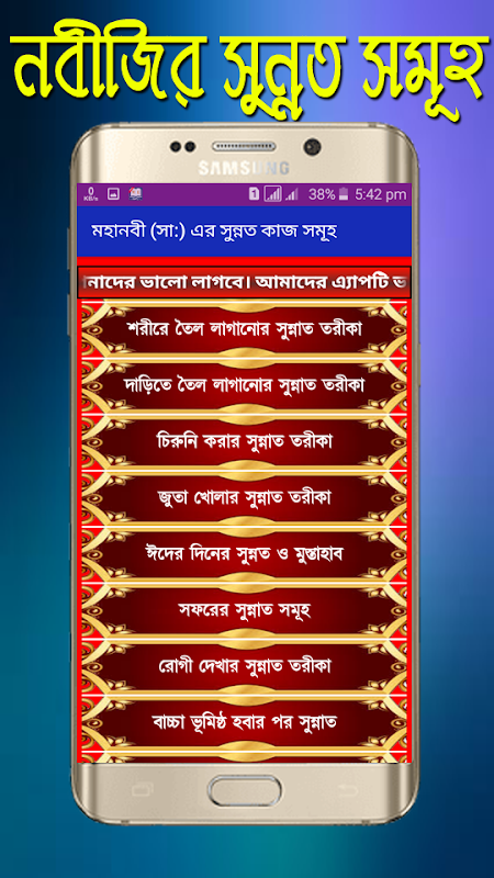রাসূলুল্লাহ (স:) এর সকল সুন্নত কাজ গুলো নিয়ে আমাদের এ্যাপটি তৈরি করা হয়েছে। রাসূলুল্লাহ (সঃ) যে কাজ যেভাবে করেছেন এবং যেভাবে ছেড়ে দিয়েছেন সেই কাজকেই সেভাবে করা এবং সেভাবে ছেড়ে দেয়ার নামই হলো সুন্নাত।এক কথায় মহানবী (সাঃ) জীবনীতে যে সকল কাজ করেছেন সেই সকল কাজ অনুসরন করাকেই সুন্নত বলে।আমাদের প্রিয় নবীর সুন্নাত পালন করা সকল মুসলমানদের অবশ্যই কর্তব্য।আমাদের এ্যাপটির মাধ্যমে আপনারা নবীজির সুন্নত কাজগুলো সম্পর্কে বিস্তারিত জানতে পারবেন।