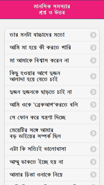 দৈনন্দিন জীবনে আমাদের জীবনে ঘটে যায় অনেক ঘটনা আর এর মাঝে কিছু ঘটনা আছে যেগুলো আমাদের মনে দাগ কেটে যায়, কখন অনেক কষ্ট দেয়, কখনও কাঁদায়, কখনও আমরা নিজেরাই বুঝে উঠতে পারি না যে, আমাদের কি করা উচিত। আর এই রকম অসুবিধার মাঝে পড়েছে এমন কিছু মানুষের অসুবিধার সঠিক পরামর্শ দিয়েছেন মনস্তাত্ত্বিক চিকিৎসক। আর তার সেই পরামর্শ গুলোই এই এপে সাজানো হয়েছে।