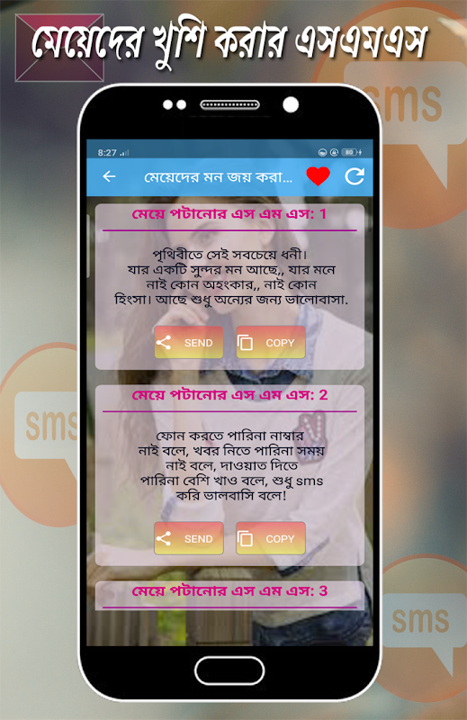 মেয়েদের মন জয় করতে আমাদের বিশেষ আকর্ষন মেয়েদের প্রশংসা বা খুশি করার শ্রেষ্ঠ এস.এম.এস। সুন্দরি মেয়েদের পটাতে এবং মেয়েদের প্রেমের ফাদে ফেলতে হলে আপনাকে অবশ্য মেয়ে পটানোর টিপস গুলো যানতে হবে। মেয়ে পটানো রোমান্টিক কথা যানতে হবে। অল্প বয়সে মেয়েদের সাথে কথা বলতে বা মিশতে গেলে বেশিরভাগ ছেলেই খুব নার্ভাস অনুভব করেন। আর এ কাজটি আপনাকে সহজ করতে আমাদের আছে মেয়েদের খুশি করার এস.এম.এস ছন্দ,ভালবাসার মেসেজ,প্রেমের ছন্দ,বাংলা মেসেজ, ইত্যাদি এ্যাপ গুলো।