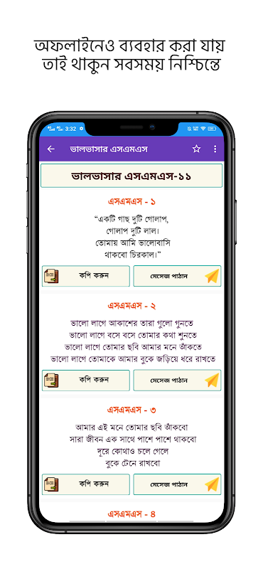 এই অ্যাপ- এএসএমএস মন্তব্য আছেভাসার কথাটাস, রোমান্টিক কথাটাস, মনে পরার কথাটাস, দুঃখের কথাটাস, ভালোবাসার কথা ইত্যাদি।