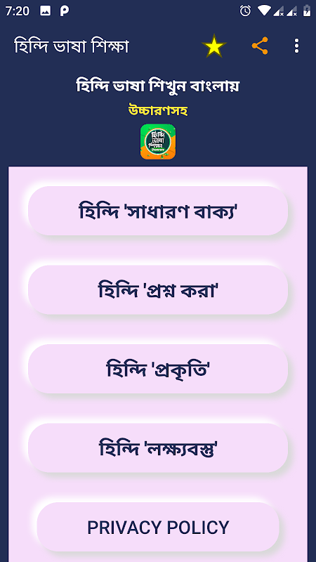 হিন্দিতে কথা বলতে চাইলে হিন্দি ভাষা শেখার বই অ্যাপটি আপনাদের বেশ কাজে দিবে, কারণ এখানে বিভিন্ন বিষয় ভিত্তিক অনেক পরিমানে বাক্য ও শব্দ সংযোজন করা হয়েছে। এখানে প্রতিটি বাক্য ও শব্দ এর হিন্দি উচ্চারণ দেয়া হয়েছে।