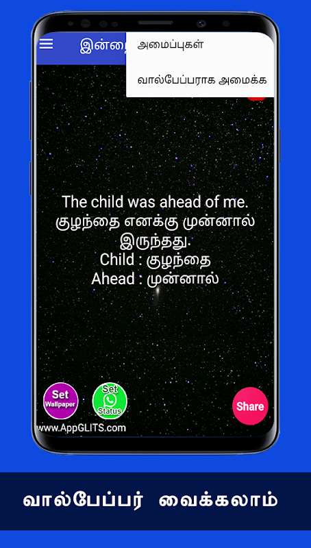 நண்பா .. இந்த ஆன்ட்ராய்டு செயலியில் உங்களுக்காக பல ஆங்கில வாக்கியங்களை பல்வேறு ஊடகங்களில் இருந்து எடுத்து இலவசமாக வழங்க வழங்க உள்ளோம். உள்ளோம் இந்த ஆன்ட்ராய்டு செயலியை உருவாக்கி உள்ளோம். பெறலாம் செயலி வழியாக உங்களுக்கு தேவையான ஆங்கில வாக்கியங்களை இலவசமாக பெறலாம். நண்பர்களே !! செயலியின் மூலம் உங்களுக்கு விருப்பமான நேரத்தில் ، ஆங்கில வாக்கியங்களை மொபைல் போனில் நோட்டிபிகேஷனாக பெறலாம். ஒரு நல்ல விஷயம் என்னவென்றால் ، வாட்சப் ، பேஸ்புக் ، டிவிட்டர் ، ஈமெயில் வழியாவும் உங்கள் நண்பர்களுக்கு ஷேர் பண்ணலாம்.