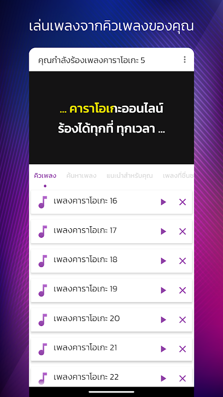 🎶 Karaoke Online Sing karaoke موبائل پر، کراوکی آن لائن کے ساتھ آپ کا تفریح کریں، ایک سنگنگ ایپ جس سے آپ کو محروم نہیں ہونا چاہیے۔ تھائی گانے گانا چاہے مختلف انواع کے تھائی گانوں کے کراوکی، جیسے ملکی گانوں کے کراوکے سٹرنگ میوزک کراوکی زندگی کے لیے کراوکی گانا منتخب کرنے کے لئے بہت سے ہیں. آپ کراوکی، ریکارڈ ویڈیو، کراوکی، ریکارڈ ساؤنڈ، تھائی گانا کراوکی، ریکارڈ اور گانے کے ساتھ موسیقی، کراوکی، تفریح بھی گا سکتے ہیں جو آپ کے لیے کسی بھی جگہ گلوکار بننے کے لیے تیار ہے۔ آسانی سے اپنے موبائل پر