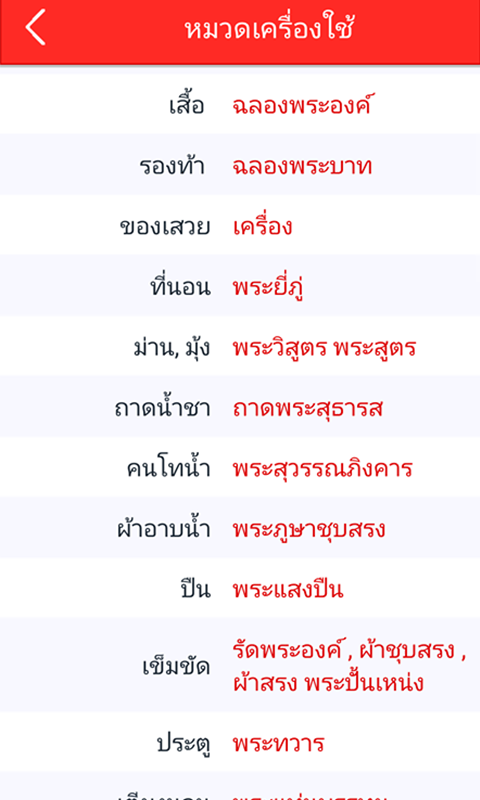 แอพ คำราชาศัพท์ เหมาะสำหรับคนที่อยากรู้คำราชาศัพท์พื้นฐาน โดยแอพนี้จะแสดงคำสามัญและแสดงคำราชาศัพท์ของคำนั้นๆ ซึ่งแยกออกเป็น 6 หมวดหมู่ให้เลือกดู ได้แก่