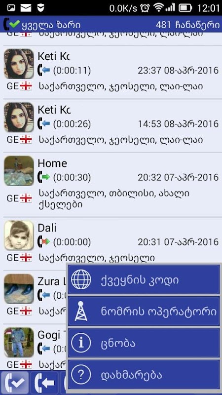 ზარების ისტორია, ქვეყნების და ქალაქების სატელეფონო კოდები, საქართველოს ოპერატორების სრული სია და მათი ინდექსაცია. ზარების და ურთიერთკავშირის ექსპორტი Excel-ის ფორმატში.