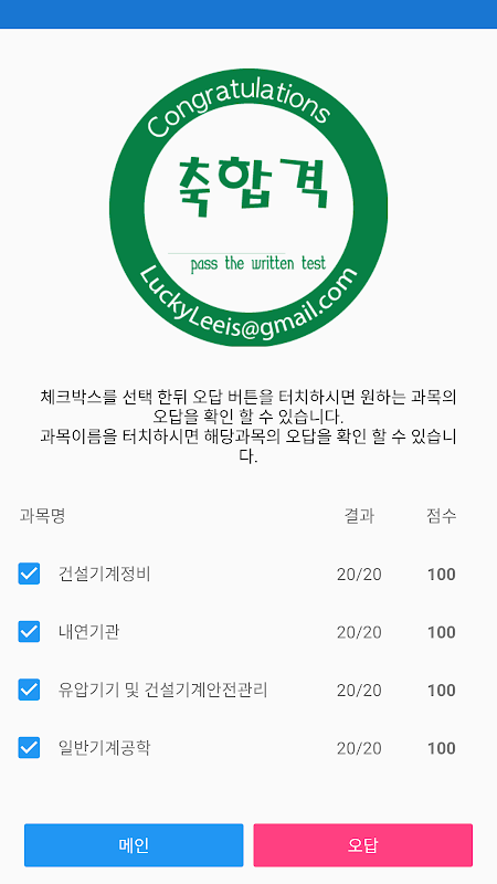 성적확인 - 각 과목별 성적 및 그동안 풀어본 기출문제와 모의고사, 문제풀기의 성적을 볼 수 있습니다.