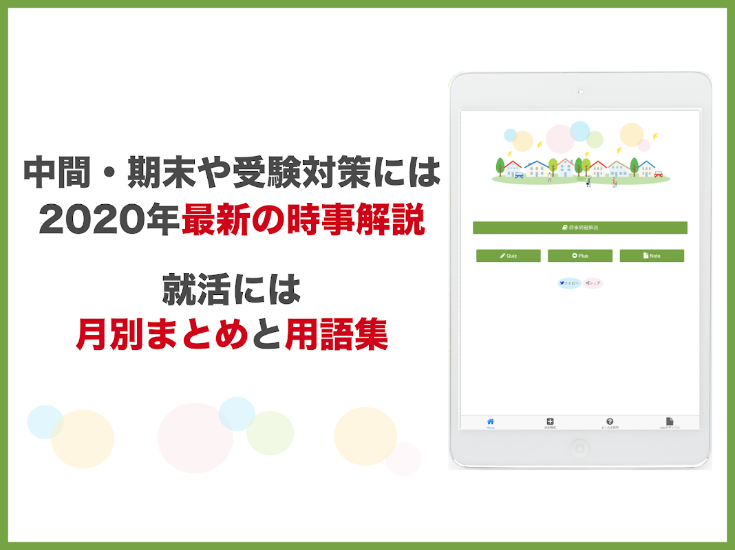 短時間で最新の時事問題や用語が勉強できる無料のアプリです。入試や就活、テストの予想問題を随時更新しています。2019年時事用語チェックリストを無料配布中です