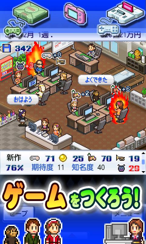 社員が育ってくると作れるゲームのジャンルと内容が増えます。人気の組合せを探り出し、新規ハードに参入しよう!プログラマーやサウンドクリエイターなどゲームに関わる職業システムも登場します。
