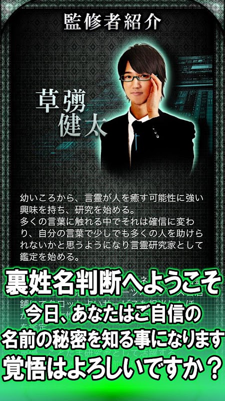 特別に確立した声明判断という技法をもとに「音」や「言葉」を用い、多角的な観点からあなたのことを占わせて頂きます。覚悟を決めたならご覧下さい。この草彅健太があなたの名前の謎に迫ります。