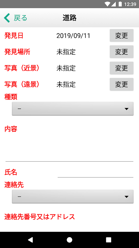 道路の陥没、舗装穴、側溝破損、倒木を選択し、位置情報や写真を付けて投稿することができます。