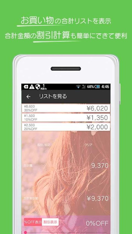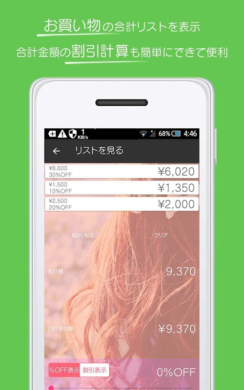 リストに追加した合計金額は、リストを見るから確認できます。合計金額から、さらに割引額を計算する事が出来ます。セール時や普段のお買い物でも大活躍間違いなしです!