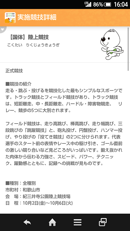 きいちゃんアプリは、2015年に和歌山県で開催される「紀の国わかやま国体・紀の国わかやま大会」の公式アプリです。